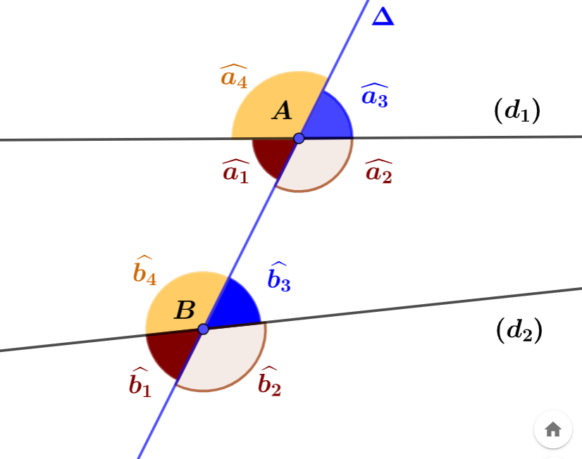 Si deux droites $(d_1)$ et $(d_2)$ sont parallèles et coupées par une droite sécante $\Delta$ en deux points $A$ et $B$ respectivement, alors les angles correspondants qu’elles forment sont de même mesure.