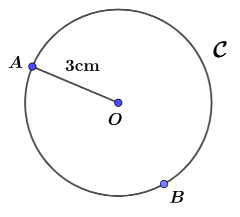Dans la figure 3, ${\mathcal C}$ est le cercle de centre $O$ et le rayon $r$. On voit que $A\in{\mathcal C}(O;3cm)$ et $B\in{\mathcal C}(O;3cm)$. Donc $OA=OB=rayon$. D’où $OA=OB=3$cm.