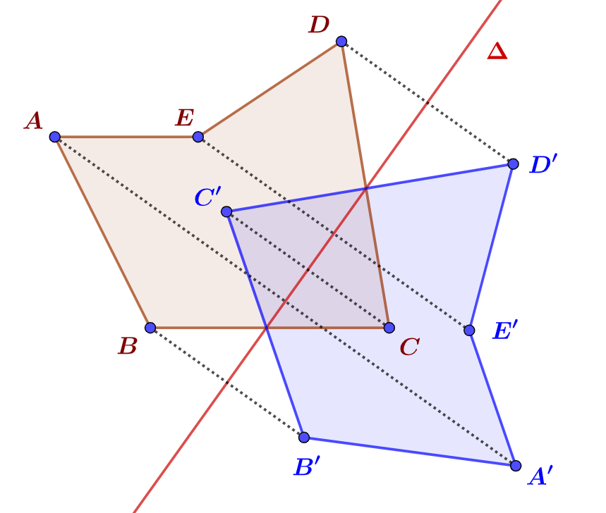 $(P_4)$. Le symétrique d’un polygone $ABCDE$ par rapport à une droite est un polygone $A’B’C’D’E’$ superposable.