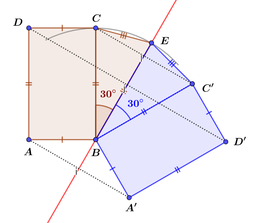 Construire un carré $ABCD$ de largeur $AB=$3cm et de longueur $BC=5$cm. Placer un pont $E$ à l’extérieur du rectangle $ABCD$ avec $BCE$ soit un triangle isocèle en $B$ et $\widehat{CBE}=30°$.