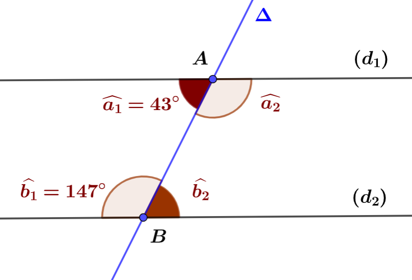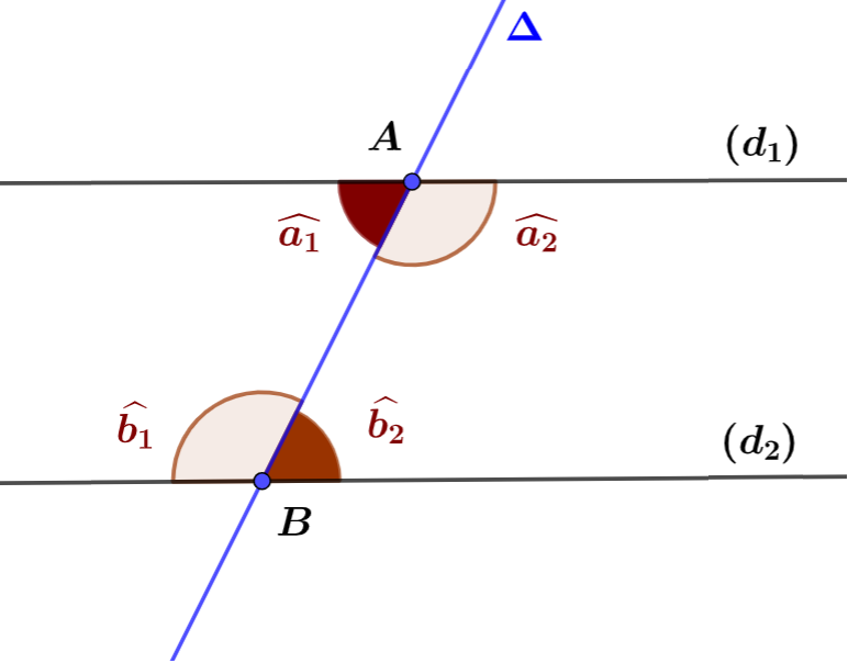 Si deux droites $(d_1)$ et $(d_2)$ sont coupées par une droite sécante $\Delta$ en deux points $A$ et $B$ respectivement en formant deux angles alternes-internes de même mesure, Alors les droites $(d_1)$ et $(d_2)$ sont parallèles.