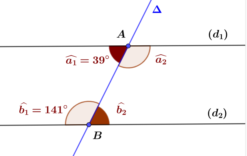 Nous avons vu (angles alternes-internes) que si deux droites $(d_1)$ et $(d_2)$ sont parallèles et coupées par une droite sécante $\Delta$ en deux points $A$ et $B$ respectivement, alors les angles alternes-internes sont de même mesure.
