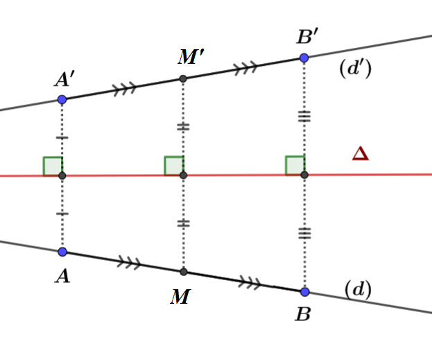 $\bullet$ Si $M$ est le milieu du segment $[AB]$ et $A’$, $M’$ et $B’$, les symétriques de $A$, $M$ et $B$ par rapport à la droite $\Delta$, respectivement. Alors : $M’$ est le milieu du segment $[A’B’]$. $$\boxed{~\text{Si}~MA=MB~~\text{Alors}~~M’A’=M’B’~}$$