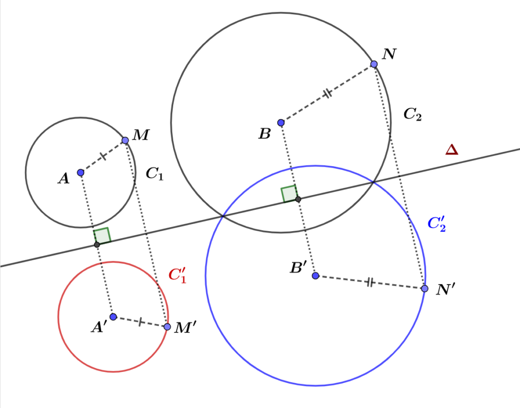 $(P_6)$. Le symétrique d’un cercle de centre $A$ et de rayon $r$ par rapport à une droite est un cercle de centre $A’$, symétrique de $A$ et de même rayon $r$.
