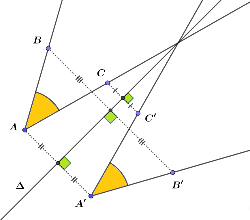 $(P_7)$. Le symétrique d’un angle $\widehat{xAy}$ par rapport à une droite est un angle $\widehat{x’A’y’}$ de même mesure. $\boxed{~\widehat{xAy}=\widehat{xAy}~}~~\text{et}~~\boxed{~\widehat{BAC}=\widehat{B’A’C’}~}$$