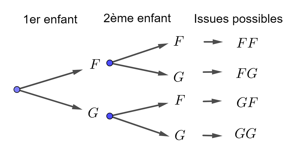 On appelle $F$ l’événement « obtenir une fille » et G l’événement « obtenir un garçon » à chaque naissance.